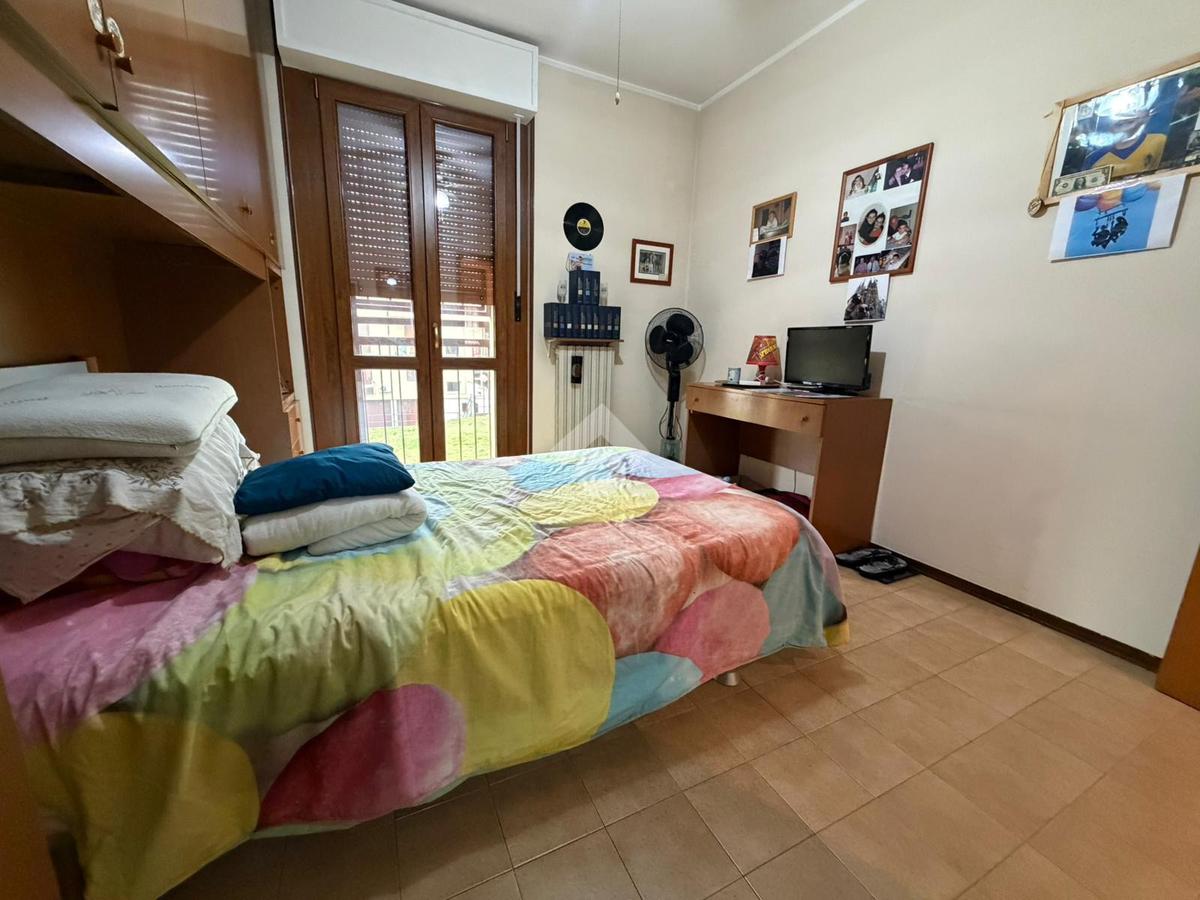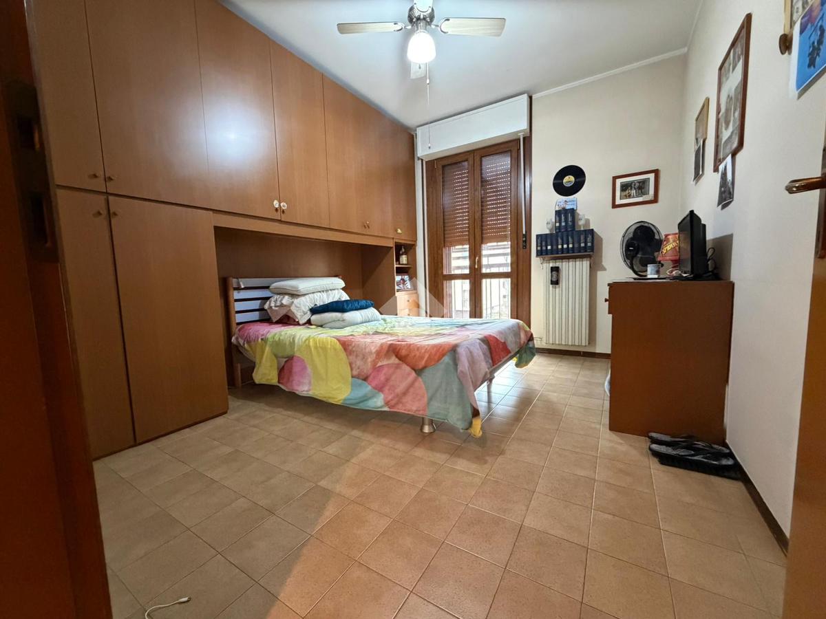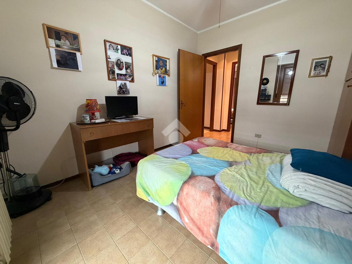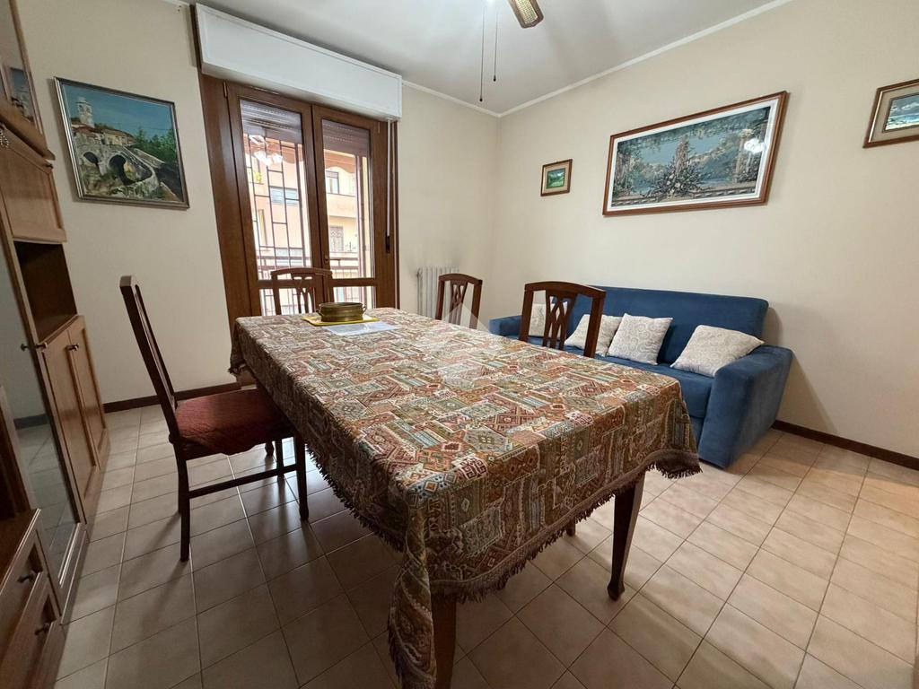 L'immobile è così composto: ingresso in disimpegno, soggiorno con accesso sul primo balcone con affaccio esterno, cucina abitabile con accesso sulmsecondo balcone dell'immobile con affaccio su strada, due ampie camere matrimoniali e servizio finestrato con box doccia e vasca.